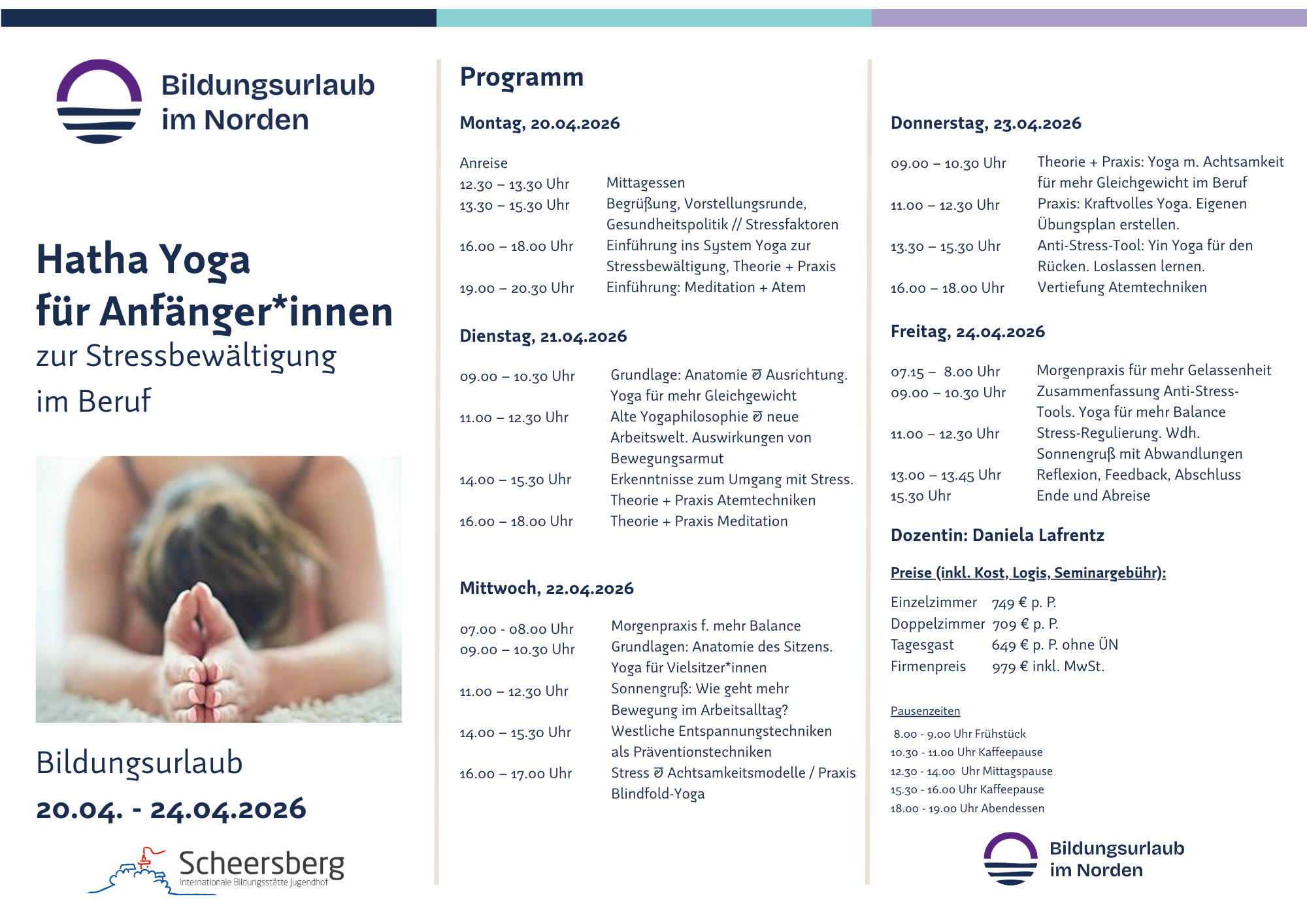 Im Seminar werden unterschiedliche Methoden aus Yoga, Meditation, Atem- und Wahrnehmungsübungen erfahren, die helfen für das Berufsleben neue Ressourcen aufzubauen und zu nutzen. Durch die speziellen Bewegungs-, Meditations- und Entspannungseinheiten wird für körperlichen und geistigen Ausgleich gesorgt.
