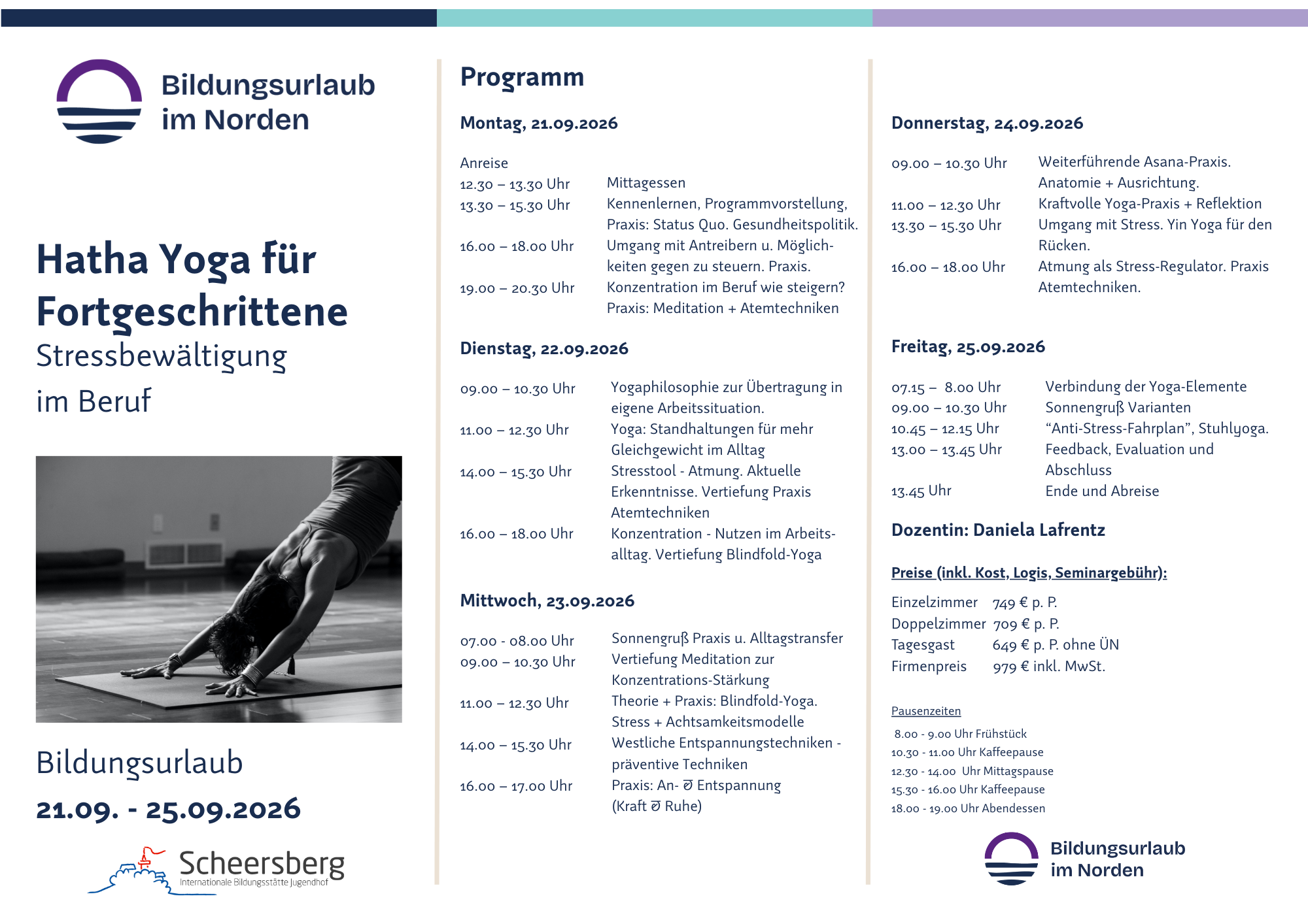 Die in den Übungseinheiten vermittelten Anti-Stress-Techniken ermöglichen eine vertiefte Yogapraxis über das Seminar hinaus - im Berufsalltag und wo immer nötig. Die Vielfalt der Yogatechniken zur Stressbewältigung helfen direkt in der Anwendung im täglichen Berufsleben, bauen Stress ab und sorgen für körperlichen und geistigen Ausgleich.