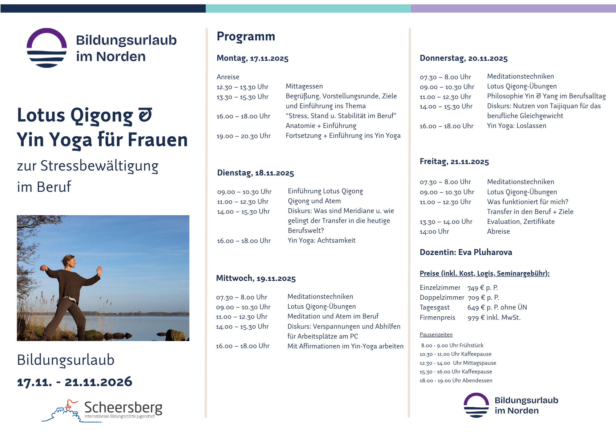 Lernziele: Erlernen von Anti-Stress-Tools aus dem Qigong, Yin Yoga, Atemtechniken und Meditationspraxis. Konkret: